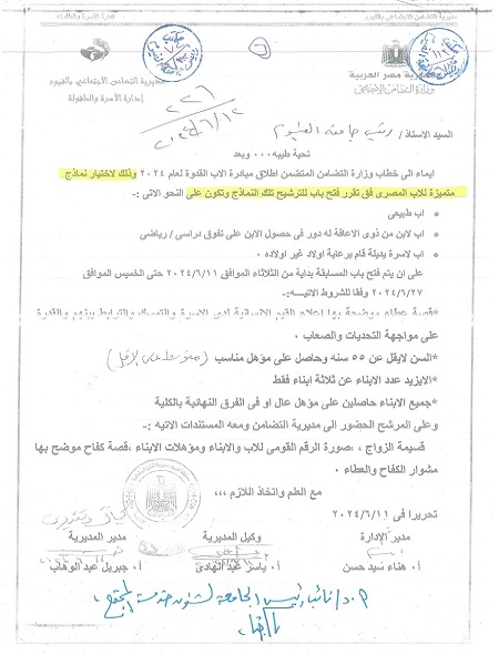 أطلقت مديرية التضامن الإجتماعي مبادرة الأب القدوة لعام ٢٠٢٤، وذلك لاختيار نماذج متميزة للأب المصري، علي أن يتقدم المرشح إلى مديرية التضامن الاجتماعي بالفيوم في موعد غايته ٢٧/٦/٢٠٢٤ لتقديم المستندات المطلوبة وفقًا للشروط المرفقة.