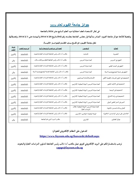 تعلن جامعة الفيــوم عن فتـــح بـــاب التقـــدم لجوائز جامعة الفيوم لعام 2024 وفقًا للجدول المرفق.