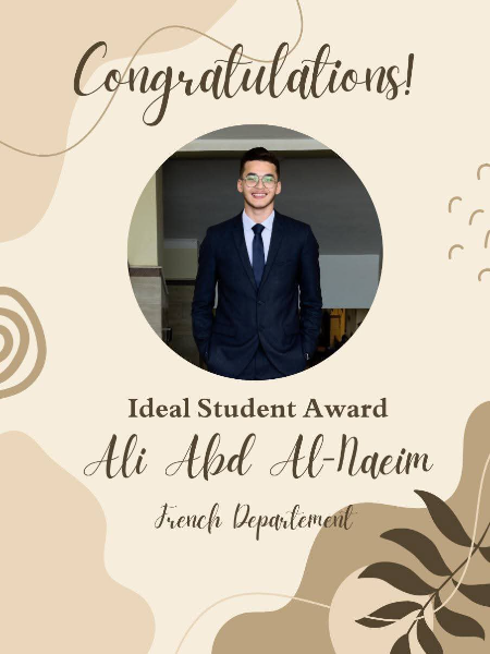 تتقدم أ.د. نجلاء سعد عميد كلية الألسن وأ.م.د أمل إبراهيم وكيل الكلية لشئون التعليم والطلاب باخلص التهاني للطالب