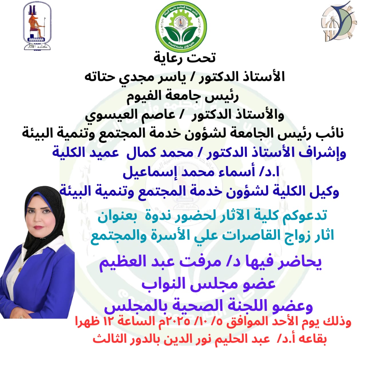 تدعوكم كلية الآثار لحضور ندوة بعنوان آثار زواج القاصرات علي الأسرة والمجتمع.