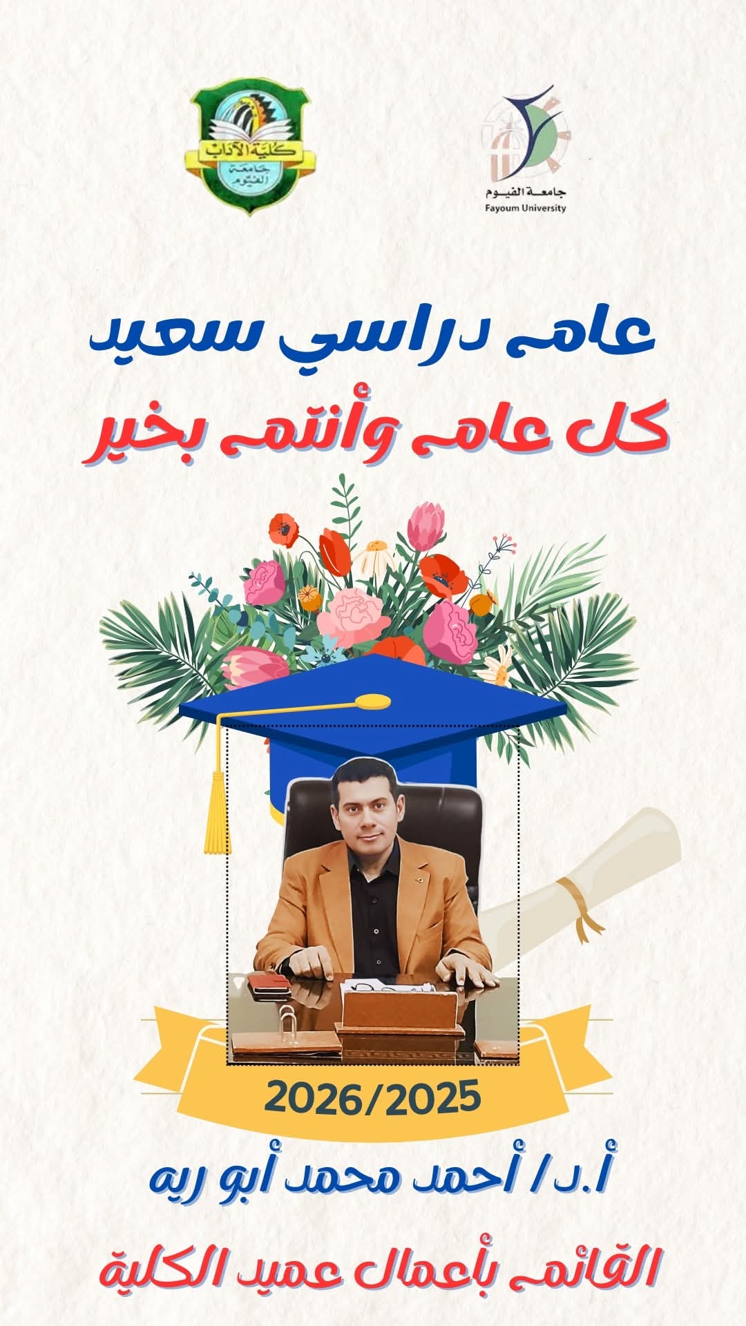 يسعد الأستاذ الدكتور أحمد محمد أبو ريه القائم بأعمال عميد الكلية، وجميع السادة الوكلاء( أ.د محمد زايد : وكيل الكلية لشئون التعليم والطلاب ، وأ.د هانى ابو العلا :وكيل الكلية لشئون البيئة وخدمة المجتمع)، أن يتقدموا بأسمى آيات التهاني والتبريكات إلى كافة منسوبي الكلية مع إطلالة عام دراسي جديد مليء بالآمال والطموحات. هذا العام الذي يحمل في طياته فرصاً ذهبية للنمو الأكاديمي والتطور المهني، ويمثل بداية مرحلة جديدة من العطاء والإبداع في رحلة العلم والمعرفة.