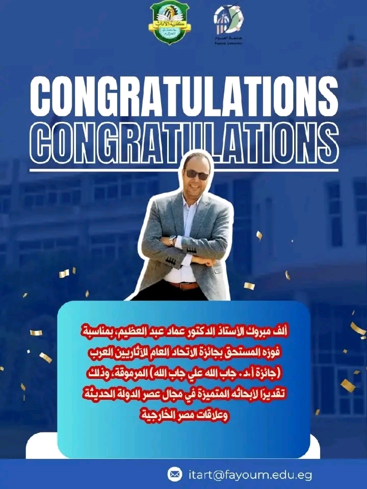باسم أسرة كلية الآداب بجامعة الفيوم، يتشرف الأستاذ الدكتور أحمد محمد أبو ريه القائم بأعمال عميد الكلية ووكيل الكلية لشئون الدراسات العليا والبحوث، بأن يتقدم بأصدق التهاني وأعمق التبريكات إلى الأستاذ الدكتور عماد عبد العظيم، بمناسبة تتويج مسيرته البحثية المتميزة بالفوز بجائزة الاتحاد العام للآثاريين العرب الرفيعة (جائزة أ.د. جاب الله علي جاب الله)، تقديرًا لإسهاماته العلمية الرائدة وأبحاثه الأصيلة في مجال عصر الدولة الحديثة وعلاقات مصر الخارجية.