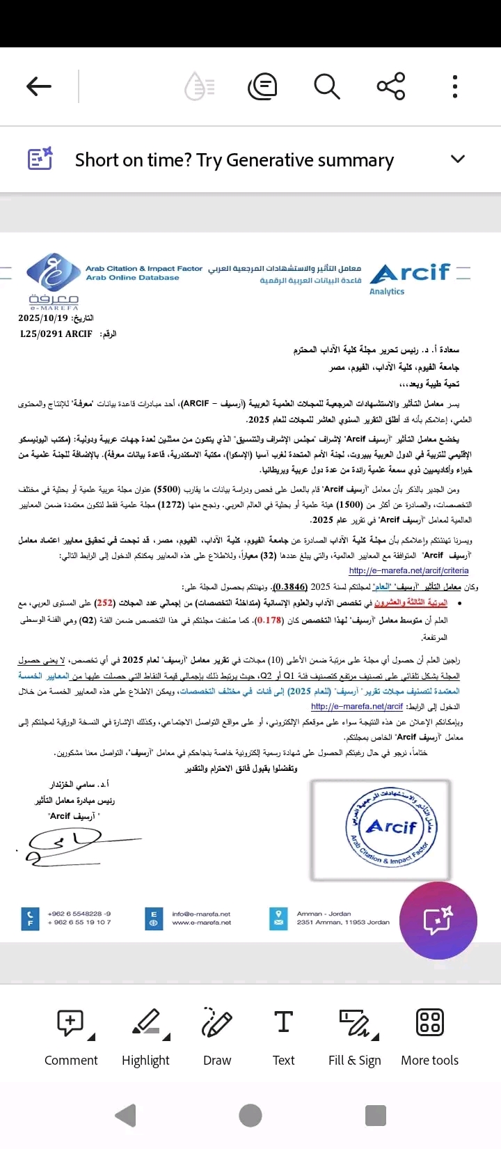 🔹 دخول المجلة ضمن أفضل 25 مجلة علمية على مستوى العالم العربي، وفقًا لتقرير معامل التأثير والاستشهادات المرجعية للمجلات العلمية العربية (ARCIF) لعام 2025.
