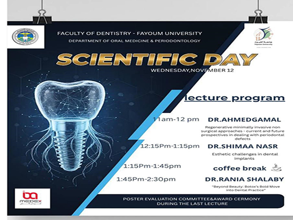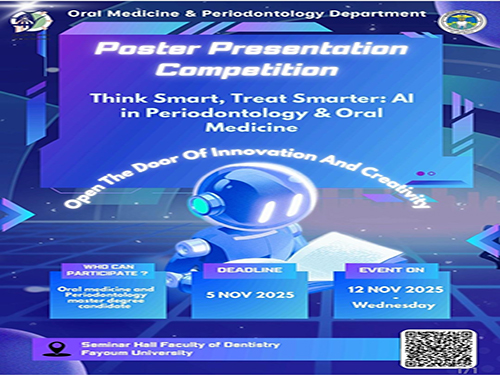 Anya Hassan Anwar Shalaby, Head of the Department of Oral Medicine and Periodontology, announces that the college is organizing a scientific day for the Department of Oral Medicine and Periodontology on Wednesday, November 12, 2025, at 11:00 AM in the seminar hall.