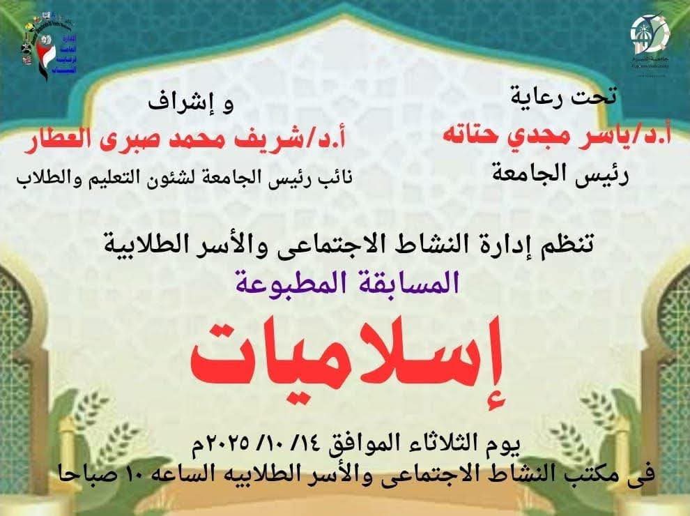 تنظم إدارة النشاط الاجتماعي والأسر الطلابية المسابقة المطبوعة اسلاميات وذلك يوم الثلاثاء الموافق ٢٠٢٥/١٠/١٤ في تمام الساعة ١٠ صباحاً