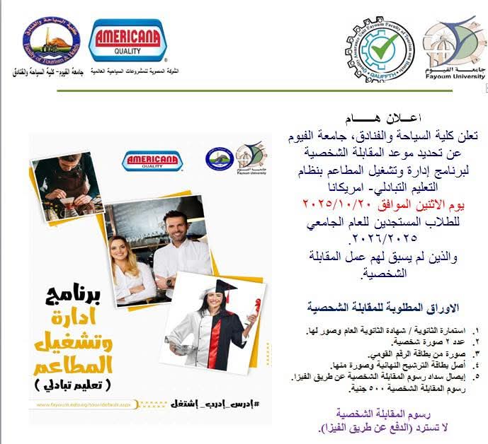 تعلن كلية السياحة والفنادق، جامعة الفيوم عن تحديد موعد المقابلة الشخصية لبرنامج إدارة وتشغيل المطاعم بنظام التعليم التبادلي- امريكانا