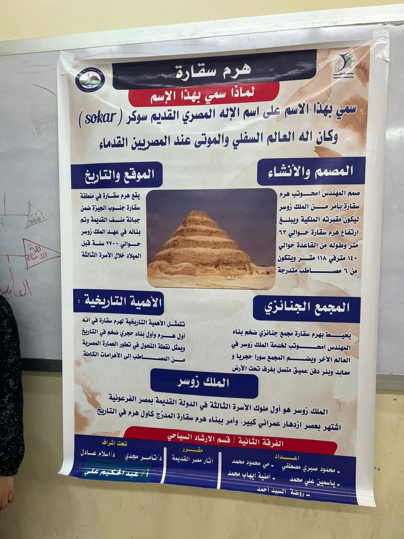 تحت رعاية أ.د أشرف عبد المعبود عميد الكلية وإشراف أ.د وليد الهادى رئيس قسم الإرشاد السياحى وفي إطار حرص القسم على تعزيز الجوانب التطبيقية في العملية التعليمية، نظم طلاب المستوى الثاني ببرنامج الإرشاد السياحي نشاطًا عمليًا متميزًا ضمن مقرر “آثار مصر القديمة (1)”.