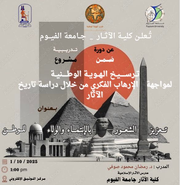 فى أطارمتابعة مراحل الخطة التنفيذية للمشروع ، تعلن كلية الآثار جامعة الفيوم عن عقد عدد من الدورات التدريبية عن أهمية التراث الثقافى الرائع للدولة المصرية ودوره فى تعزيز الهوية الوطنية لمساعدة الطلاب وإعدادهم فى التعرف على علامات التطرف الفكري بين الشباب وأهمية التراث الثقافى لتعزيز مفهوم الهوية من خلال دراسة تاريخ الآثار ، وذلك خلال الفترة من 28 سبتمبر - 1 أكتوبر 2025 م ، بمركز التوثيق الإليكترونى بكلية الآثار - جامعة الفيوم ، الساعة الواحدة ظهراً