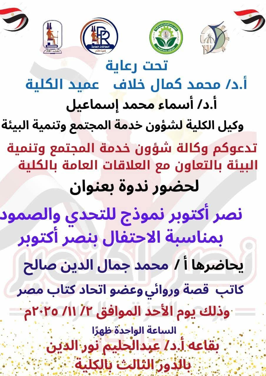 والسيد الأستاذ الدكتورة/ أسماء محمد إسماعيل وكيل الكلية لشؤون خدمة المجتمع وتنمية البيئة تعلن وكالة خدمة المجتمع وتنمية البيئة عن عمل ندوة بعنوان نصر اكتوبر نموذج للتحدي والعمود يحاضرها أ/ محمد جمال الدين كاتب وروائي وذلك يوم الأحد الموافق ٢/ ١١/ ٢٠٢٥م بقاعة أ.د/ عبدالحليم نور الدين