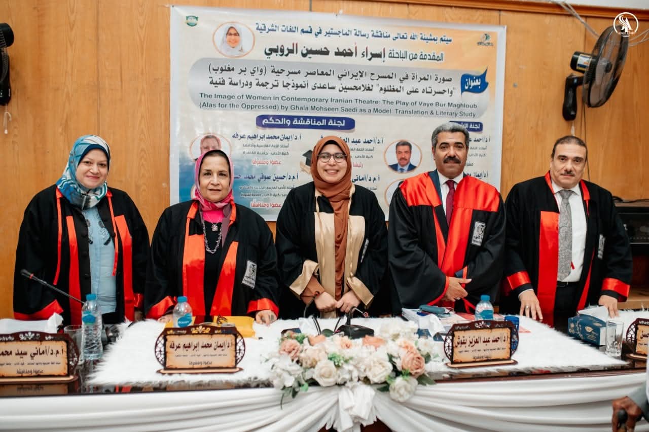 حملت الرسالة عنوان "صورة المرأة في المسرح الإيراني المعاصر: مسرحية (واي بر مغلوب) 'واحسرتاه على المظلوم' لغلامحسين ساعدي أنموذجاً - ترجمة ودراسة فنية"، وقدمتها الباحثة إسراء أحمد حسين الروبي.