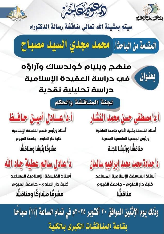 مناقشة رسالة دكتوراه بقسم الفلسفة بعنوان: منهج وليام كولدساك وآراؤه في دراسة العقيدة الإسلامية