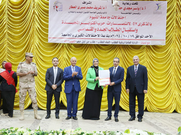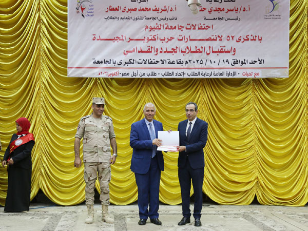 Prof. Yasser Magdy Hatata, President of Fayoum University, attended the university's celebration of the 52nd anniversary of the glorious October victories. The celebration welcomed new and returning students and honored participants in the Best University Student Activities Competition at the level of Egyptian universities.