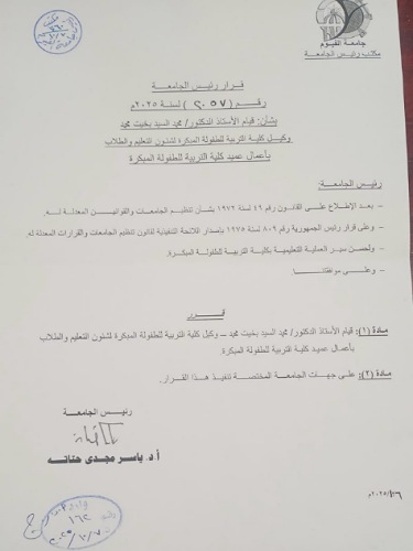 La Faculté de l'Education de la Petite Enfance, composée des doyens, des enseignants, du personnel de soutien et des employés, adresse ses sincères félicitations au Prof. Mohamed El-Sayed Bakhit, professeur au Département des Sciences Psychologiques et vice-doyen à l'Education et aux Affaires Etudiantes, pour sa nomination au poste de doyen de la Faculté. Cette nomination fait suite à la décision n° 2057 de 2025 du Prof. Yasser Magdy Hatata, président de l'Université du Fayoum.