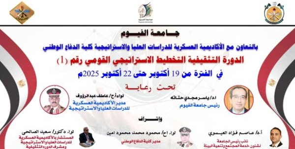 تحت رعاية الأستاذ الدكتور/ ياسر مجدى حتاته رئيس جامعة الفيوم واللواء أ.ح/عاطف عبد الرؤوف مدير الأكاديمية العسكرية للدراسات العليا والاستراتيجية، وإشراف الأستاذ الدكتور/ عاصم فؤاد العيسوي نائب رئيس الجامعة لشئون خدمة المجتمع وتنمية البيئة، اللواء أ.ح/ محمود محمد محمود أمين مدير كلية الدفاع الوطني واللواء دكتور/ سعيد الصالحي مشرف الدورة والمستشار بالأكاديمية العسكرية للدراسات العليا والاستراتيجية ، انطلقت اليوم فعاليات الدورة التثقيفية للدراسات الاستراتيجية والأمن القومي بالتعاون بين جامعة الفيوم والأكاديمية العسكرية للدراسات العليا والاستراتيجية وحاضر فيها اللواء دكتور/ سعيد الصالحي المستشار بالأكاديمية العسكرية للدراسات العليا عن موضوع " التخطيط الاستراتيجي القومي" ، بحضور ا.د/ وفاء يسري مدير مركز الخدمة العامة لتنمية المجتمع المحلي، بالجامعة وعدد من المتدربين المشاركين في الدورة من السادة أعضاء هيئة التدريس والإداريين والطلاب، وذلك اليوم الأحد الموافق 19 أكتوبر 2025 وتستمر الدورة من19 حتى 22 أكتوبر 2025 بالقاعة المركزية بمعهد البحوث والدراسات الاستراتيجية لدول حوض النيل.