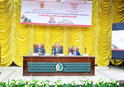 شهد أ.د /ياسر مجدي حتاته، رئيس جامعة الفيوم، الندوة التي نظمتها الإدارة العامة لشؤون خدمة المجتمع وتنمية البيئة بالتعاون مع أسرة طلاب من أجل مصر ووحدة التضامن الاجتماعي بالجامعة، تحت عنوان (انتصارات أكتوبر بين الماضي والحاضر) حاضر خلالها اللواء /أركان حرب سمير فرج، الخبير العسكري والاستراتيجي ومدير إدارة الشؤون المعنوية للقوات المسلحة الأسبق، بحضور أ.د /عاصم العيسوي، نائب رئيس الجامعة لشئون خدمة المجتمع وتنمية البيئة، وأ.د /شريف العطار، نائب رئيس الجامعة لشئون التعليم والطلاب، وأ.د /عرفة صبري، نائب رئيس الجامعة لشئون الدراسات العليا والعلاقات الثقافيَّة والبحوث السابق، والعميد شريف عامر بدوي، المستشار العسكري لمحافظة الفيوم، وعدد من السادة عمداء الكليات ووكلائها، والمقدم أحمد هندام، مدير إدارة التربية العسكرية بالجامعة، وا/عبد الناصر بكرى مدير عام الإدارة العامة لشؤون خدمة المجتمع وتنمية البيئة ،د/شيرين فتحي، وكيل مديرية التضامن الاجتماعي بمحافظة الفيوم، وأعضاء هيئة التدريس والطلاب وذلك اليوم الإثنين ٢٠٢٥/١١/٣ بقاعة الاحتفالات الكبرى بالجامعة.