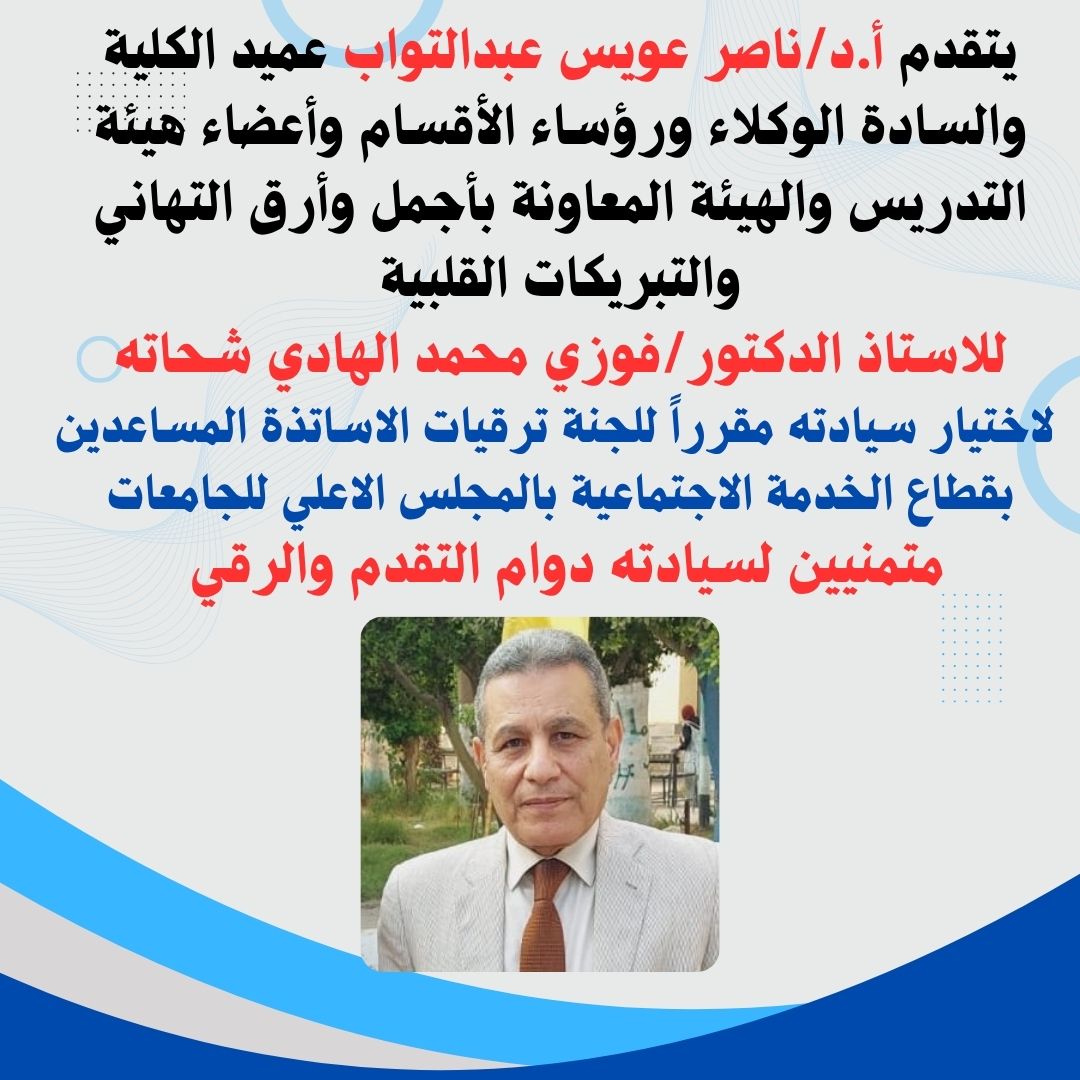 تهنئة الاستاذ الدكتور/فوزي محمد الهادي شحاتة لاختيار سيادته مقررا للجنة ترقيات الاساتذة المساعدين