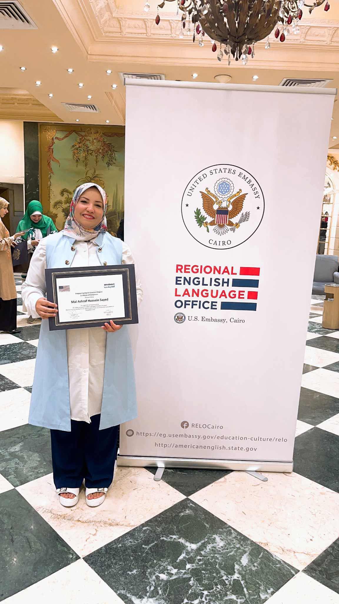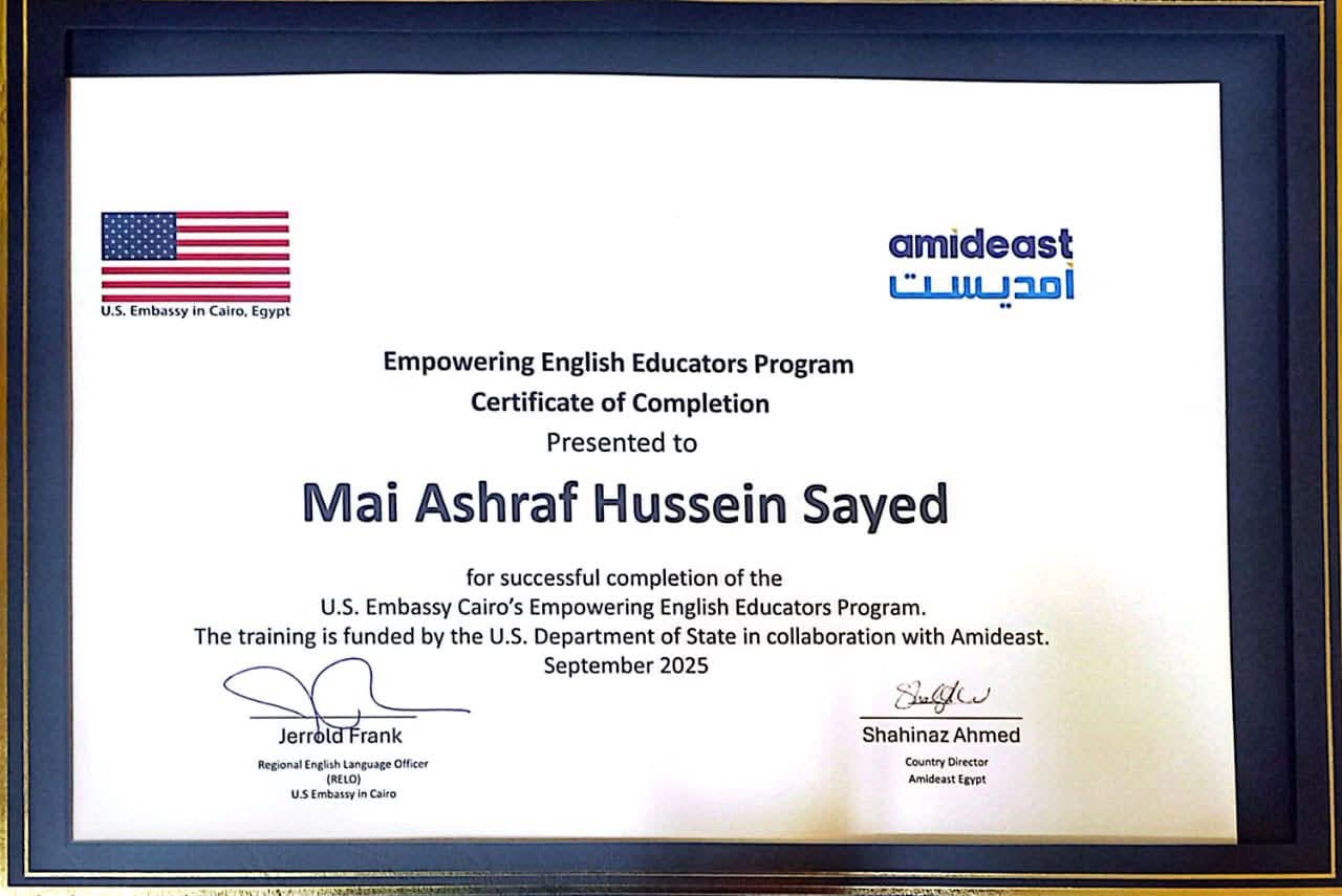يتقدم أ.د أشرف عبد المعبود عميد الكلية بأرق التهانى والتبريكات للدكتوره مى أشرف حسين مدرس اللغة الإنجليزية لإجتياز سيادتها برنامج empowering English educators من أمديست بالتعاون مع السفارة الأمريكية بالقاهرة ... لمدة ٣٠ ساعة كل يوم ٦ ساعات في الفترة من الأحد ٩/١٤ الي الخميس ٩/١٨ متمنيا لسيادتها التوفيق والتميز الدائم .