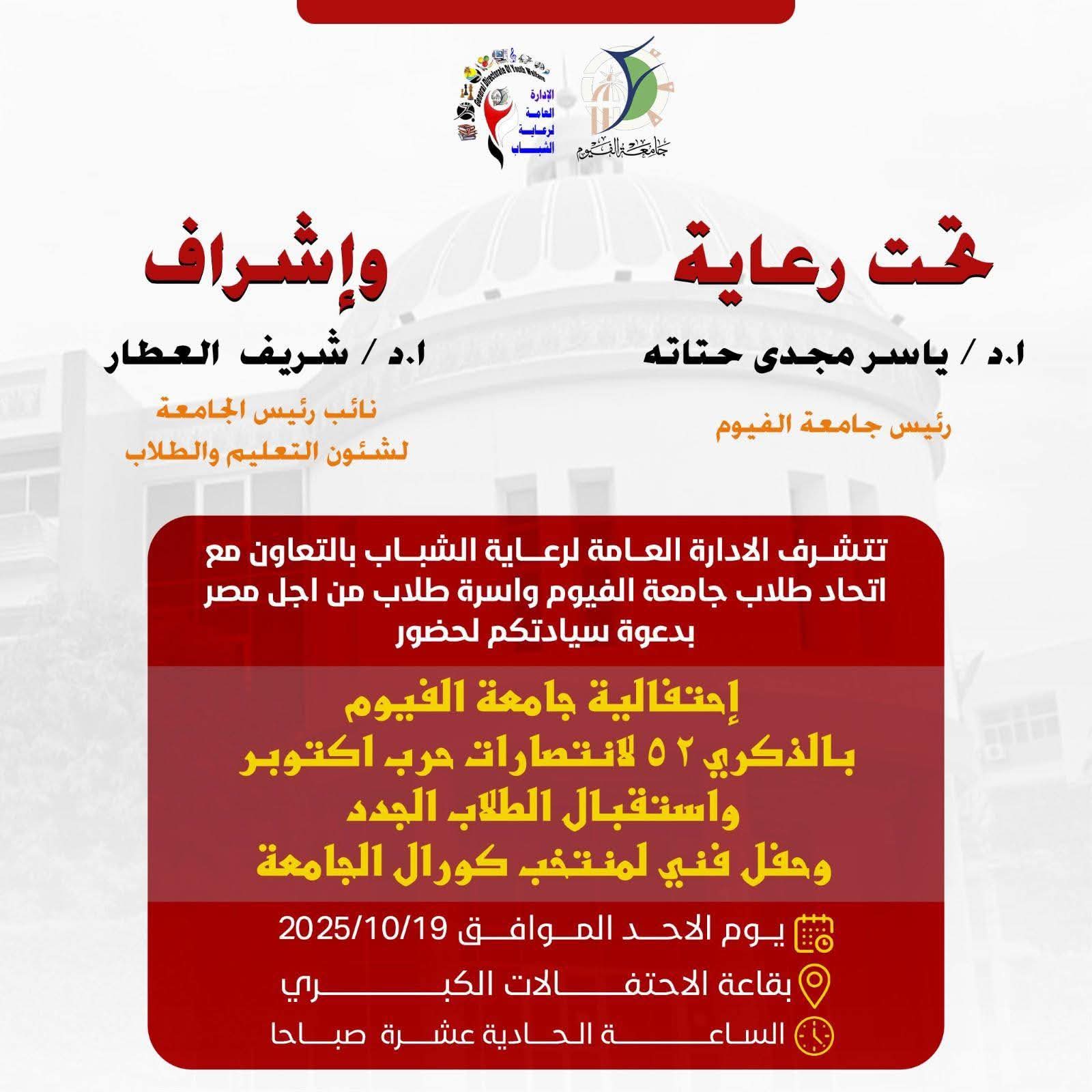 احتفالية جامعة الفيوم بالذكرى 52 لانتصارات حرب اكتوبر واستقبال الطلاب الجدد وحفل فني لمنتخب كورال الجامعة وذلك يوم الاحد الموافق ٢٠٢٥/١٠/١٩ بقاعة الاحتفالات الكبرى في تمام الساعة ١١ صباحاً